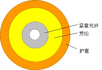 SXC單芯光纜使用單根Φ900µm或Φ600µm阻燃緊套光纖作為光傳輸介質,外覆一層芳綸作為受力加強單元,最外擠制一層聚氯乙烯(PVC)或低煙無鹵材料(LSZH,低煙、無鹵、阻燃)護套而成。